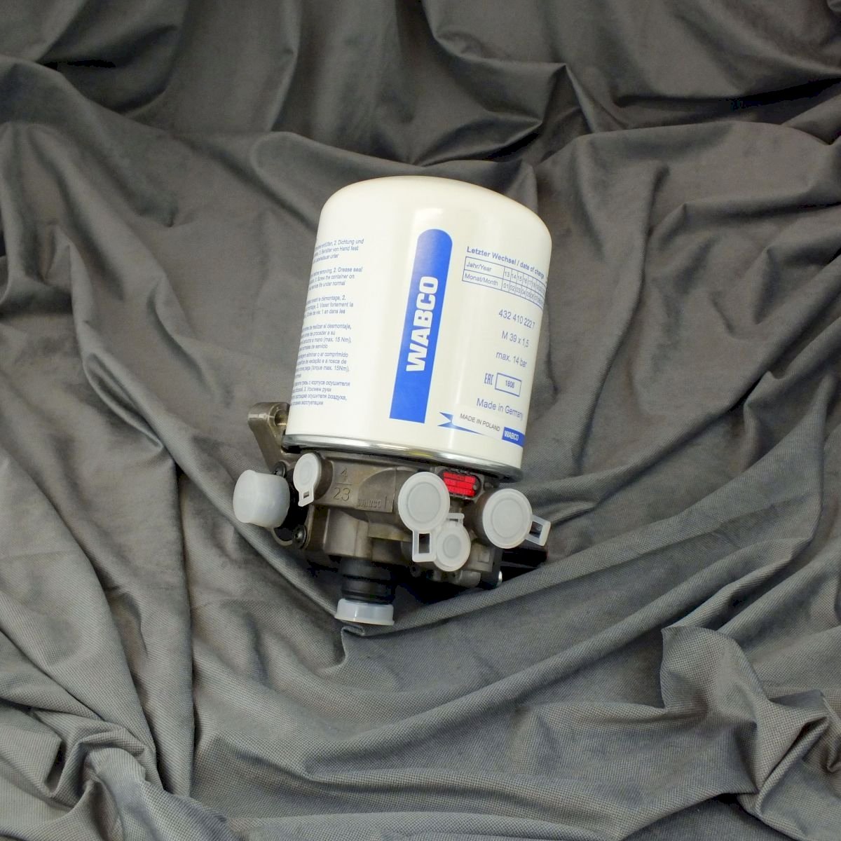 Osuszacz powietrza nr 432 410 034 7 produkcji WABCO do kompresora samochodowego. Oferowany osuszacz sprężonego powietrza do samochodu ciężarowego jest osuszaczem jednokomorowym stosowanym najczęściej w ciężarówkach marki Iveco. Osusza sprężone powietrze dostarczane przez kompresor do układu pneumatyki samochodowej. Zapewnienie odpowiedniej pracy samochodowego układu pneumatycznego zapewni zamontowanie osuszacza w pozycji pionowej.